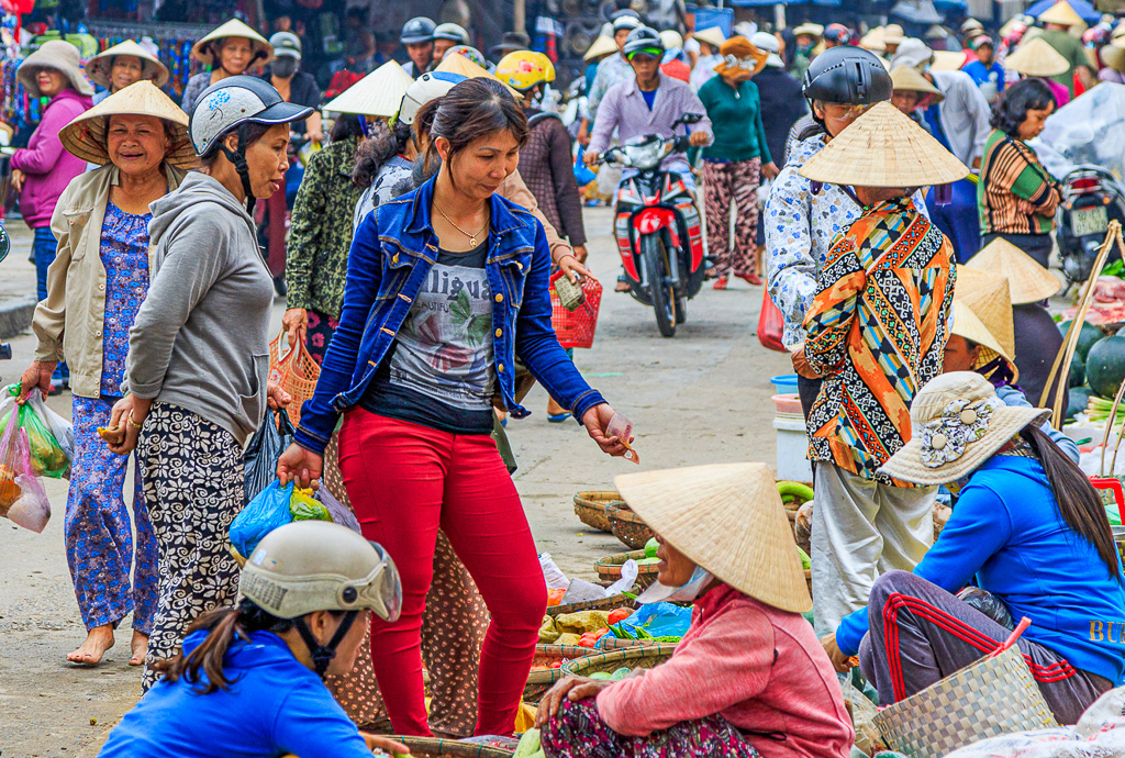 You are brave to do street photography. I always feel I've gotten caught and then don't take the photo! I enjoy looking at the variety of people and activities you captured. Did you shoot on manual or did you choose that fast shutter speed and shoot in shutter priority? The motorcyclist is aimed perfectly at the camera! I brightened the lady in the sort of center of the picture because the scene looked less dark to me that way. Also cropped off the white tent tops at the top because the whiteness bothered me but yet I miss seeing them as a descriptive part of the market scene. |
