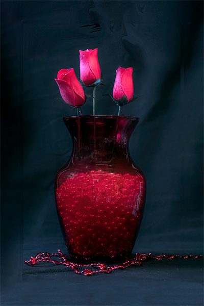 I think this is a beautiful set-up. The roses show up beautifully. I think the areas with darkness set it off. The window reflections bother me because there are so many of them. I fiddled with your image and reduced them. I also add stems to all 3 flowers, but in this little image they don't show up. And I added lots more space all around with the clone tool (rubber stamp).