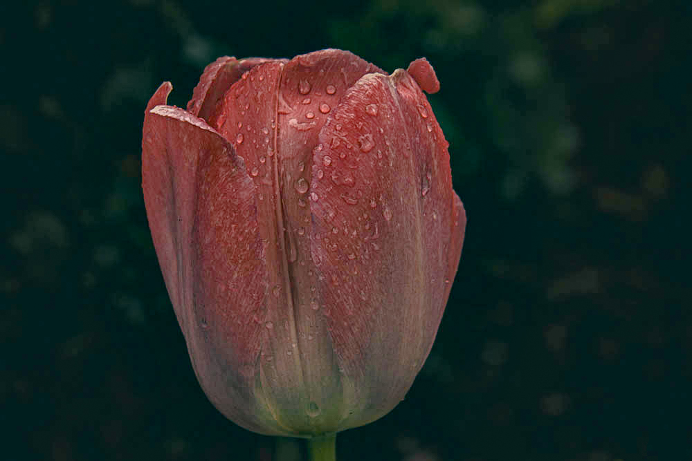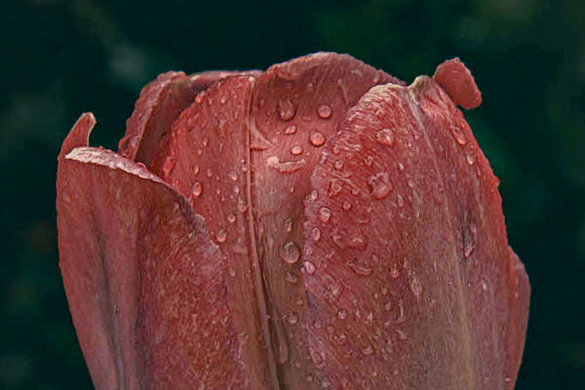 Since 3 people mentioned presenting a tulip in a vertical shot, I got to thinking that it's the unusual shot that gets noticed. So, why not keep the horizontal treatment but crop it differently. I also tilted it. The whole point of Gavin's photo was the raindrops. The tulip's stem or even the change of coloring near the stem are actually distractions. What do you think of my different crop? |