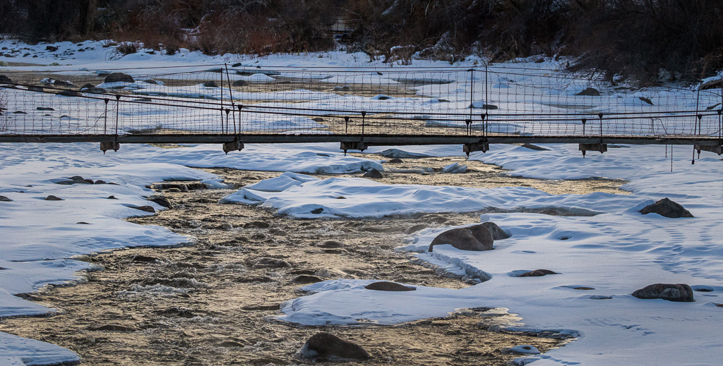 I'm impressed by the unusual content of your winter season image. I noticed the earthy stuff in the river of snow first. Then the cool horizontal lines and patterns of the footbridge. Everything is interesting but yet nothing is visually selected for me. Not that we always need a center of interest but along those lines. I tried some light sculpting on your image. I chose to make the earthy stuff lighter so that it would be a leading line to the bridge. I darkened the background and cloned away any light stuff. I did it with the PS Adjustment Brush. Not sure if you can tell the difference. The effect is supposed to be that there is now more of a reason for the photo other than the entire scene. |
