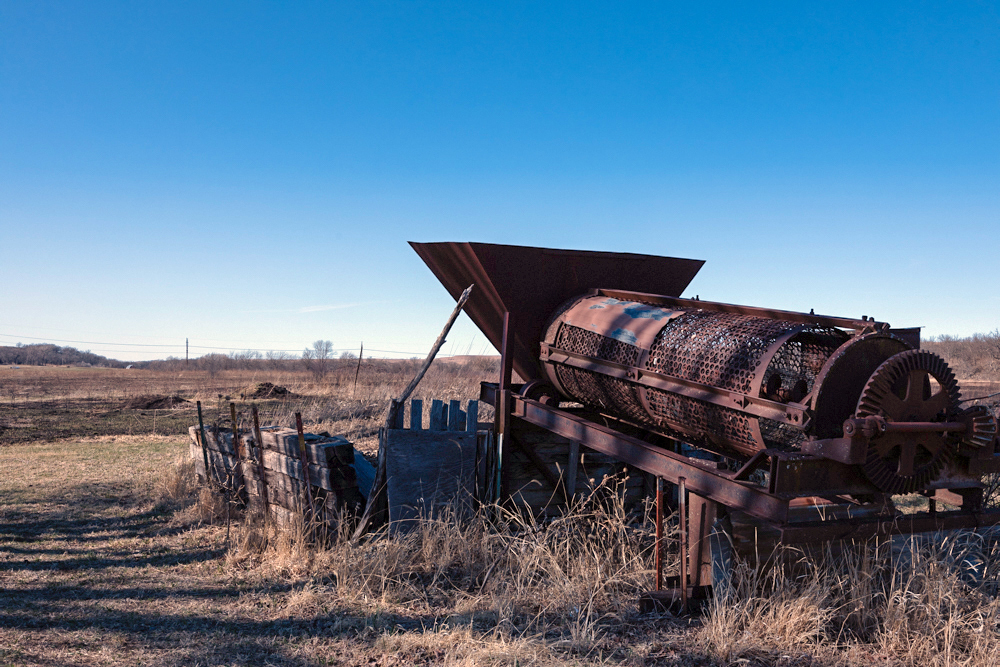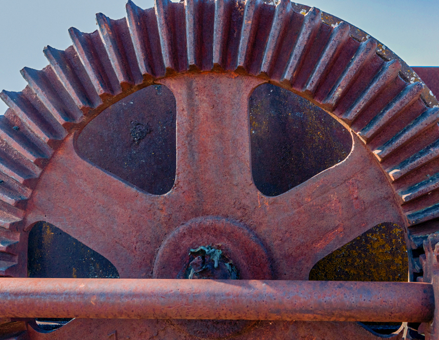 Such interesting equipment. So many shapes to the parts. I wanted to see it all better, so I brightened your photos and now post them here for everyone to see the details better. I'm not sure why your lighting is so blue. When I applied auto Levels in Photoshop, the image turned sunny-looking. I don't find the sky to be distracting. I think the brighter object in the top right pulls my eye away from the much more interesting foreground gear wheel. The part you selected reminds me very much of a face. There is a potential assigned subject of faces created like this, and I find them very hard to find. |