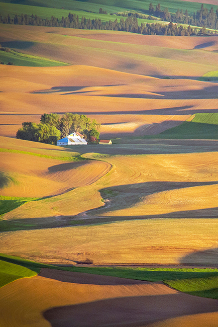 I am envious of being on that hill and looking out to see these patterns! I like your composition, but I can see there would be almost endless compositions to capture in the Palouse. At first, I thought of cropping off the top. Then, I decided I also like it if I crop off the bottom third. That places the house down lower. I think it is hard to keep the eye traveling within the picture. The light area at the top makes my eye leave the image. My eye isn't guided around the image by the patterns, but the patterns are still interesting to me. |