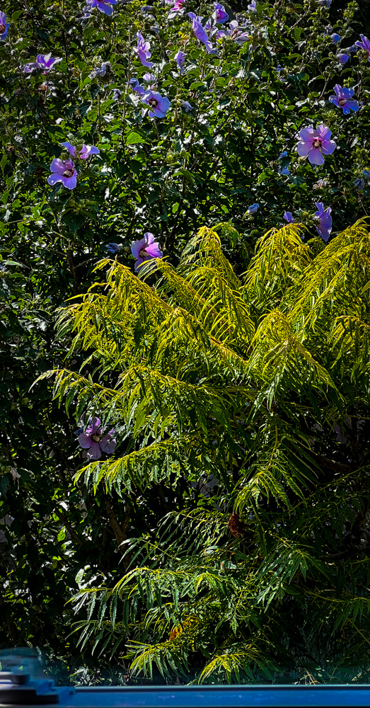 I used to have a row of Rose of Sharon bushes, so I know how beautiful they are. Midafternoon is a good time to take photos of the flowers because they show up so well. My immediate reaction to this photo was that it needed a simple vignette, because my eyes aren't kept in the image without it. With the slight darkening of the image's edges, my eye stays on the light areas. This helps me appreciate the plants. I think the image looks less like a snapshot when the view is limited like that. What do you think? |