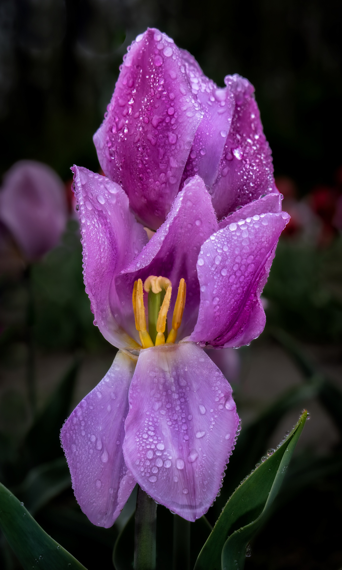 This turned into a great big WOW when I clicked on your finished image and saw the water drops enlarged! What a spectacular catch of water drops! I highly appreciate your efforts to take this picture after reading your explanation of how you dealt with the rainy weather. Now I know for sure you didn't take an easy way out and simply spray water on the flower on a sunny day! When I see flowers with the darkened, out-of-focus background, I think I can see them that way in real life, and I go looking in vain for that look. But your editing description reminds me that we can create this kind of image with good post-editing. My only suggestion would be to remove the light-colored horizontal petal that seems to be pointing to the center of the main amazing flower. |