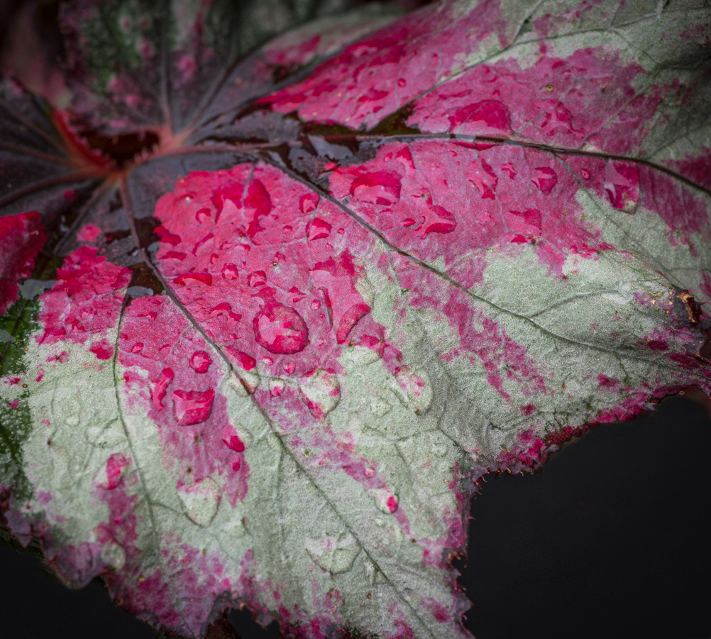 You chose a lovely-looking plant to photograph. Its coloring and designs make the image interesting and unique. I'm thinking if all the drops were equally sharp, you might be happier with the image. One way to get a larger depth of field is to shoot farther away and crop to this area. Extension tubes and such are better when you want just one little thing in focus. I like your edited photo where you removed the distractions of the extra white areas at the bottom and right edges. If it were my photo, I'd also remove the small white circular area at the upper left corner. |