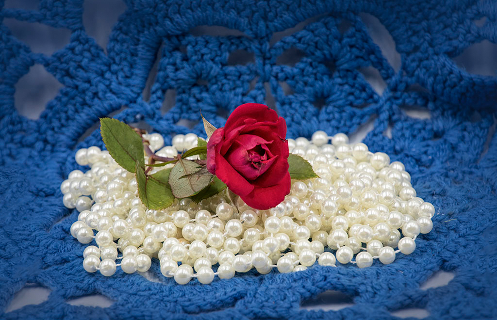 The pearls are lovely and stand out almost too much. I edited your photo to emphasize the red rose by brightening its shadows. I didn't even have to lower the highlights on the peals. I'm glad, because I like the way they shine.