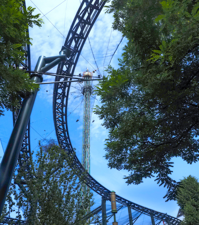 I do get the dizzy feeling you refer to! I could never ride this one, either! Looking up through the "pointing" trees and tracks has created a leading line perspective. My suggestion to increase this sensation is the crop I made, by putting the tower top nearer the upper left intersection of the tic-tac-toe grid of composition. I'm getting old and forgot the official name of this composition technique! While I was doing the crop, I looked to see what would happen if I lightened the dark parts of the trees by moving the Shadows slider. I love to play with photos, and so in Photoshop ACR filter I also darkened the brightest areas of green and then did the same to the blue of the sky. Of course, now it looks like a different picture with a different effect on the viewer. The leading lines effect is more prominent in your darker photo. I think the more intense colors have distracted in a sense. Or is it just me? |