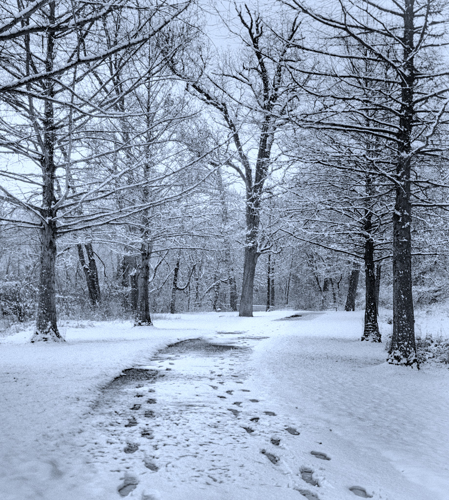 As I sit down to write these comments, I discover the view out my window is another SNOWY day. It happened overnight. So surprised. I love the way the snow has attached itself to your trees and ground. Those pristine footsteps feel like the point of the picture. They seem to be from 2 people walking towards me. Sort of a reverse leading line!