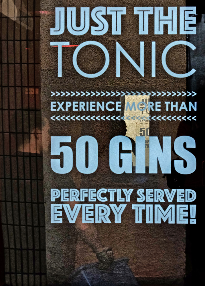 If one gin wasn't enough, what about 50? The texture is from the wall behind me and the shadow of the cleaner inside and the advert appear on the back wall of the pub. |