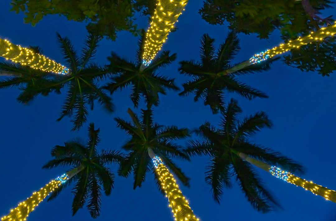 I've taken all the suggestions and have produced an edited version that lightens the central "oval" of palm leaves, eliminated the 5th tree jutting in from the left edge, and subdued the brightness of the lights on the trees.