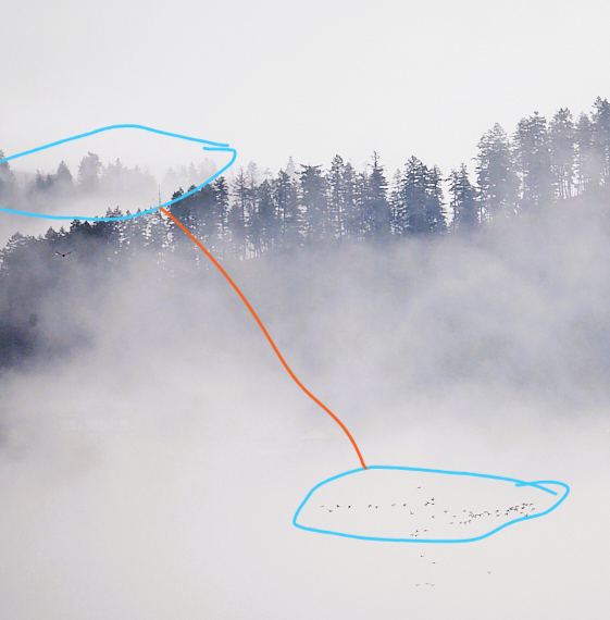 I like the ethereal look of a forest in fog, especially when there are multiple layers of trees poking through the whiteness. I like the addition of the geese to add something to the lower half of the image, but feel that they are too small to help carry the interest in that area.