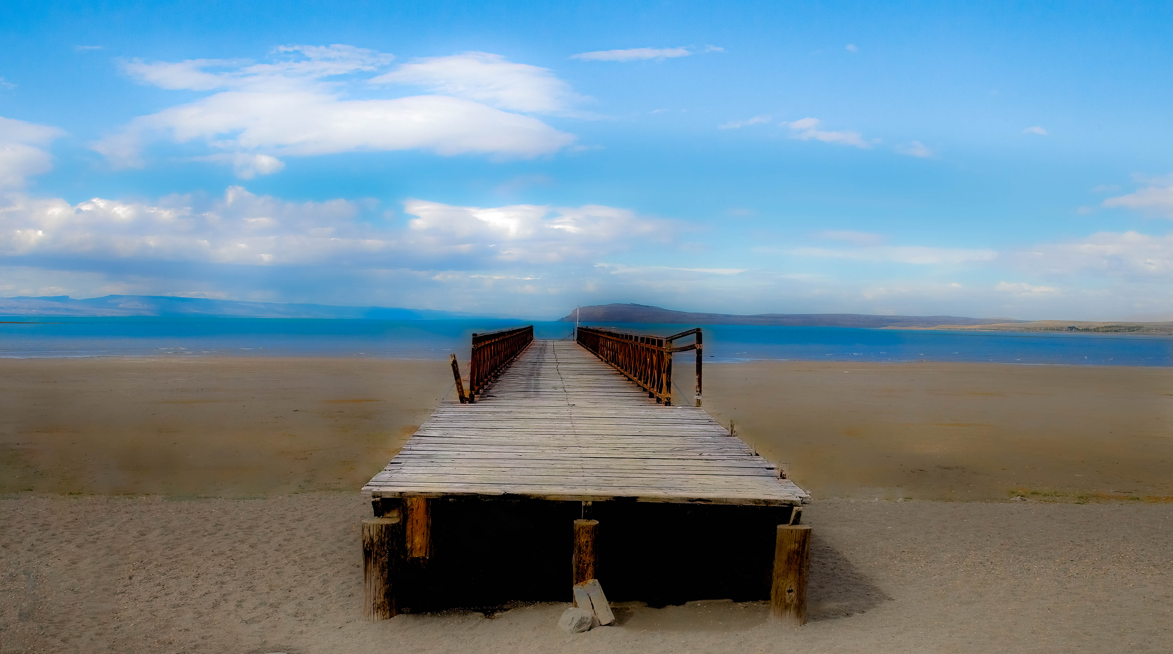 I literally laughed out loud when this image first popped up. It reminded me of an image that I took 3 years ago when I was in the Patagonia region of Argentina, at the edge of a glacier-fed lake, standing at the end of a pier that went out ....to nowhere. There was no water anywhere close to the far end. When I took that image, I had a vision of an ethereal setting that was "otherworldly". I tried to convey that in the postprocessing. (see attached)