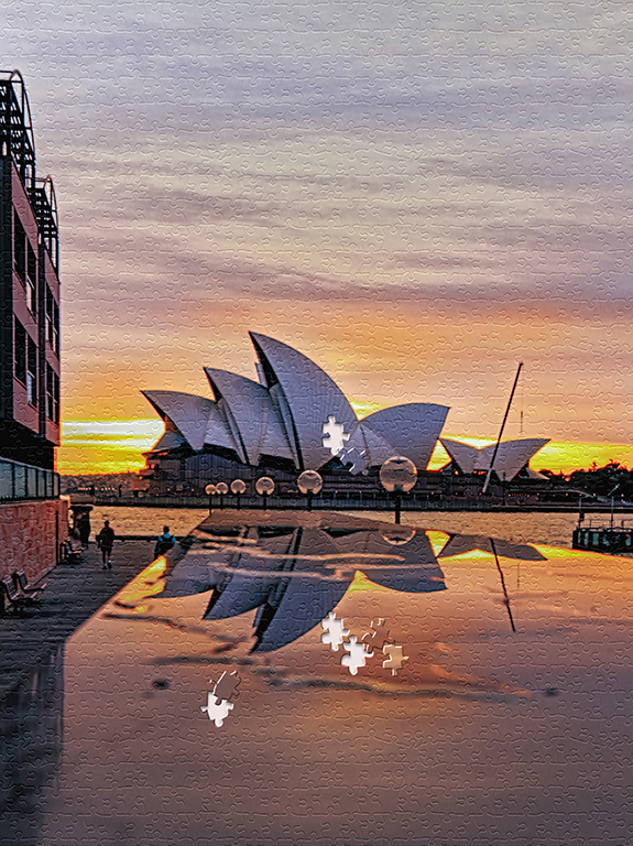 Water has been poured over a surface of a marble block which create a reflection of the Sydney Opera House.