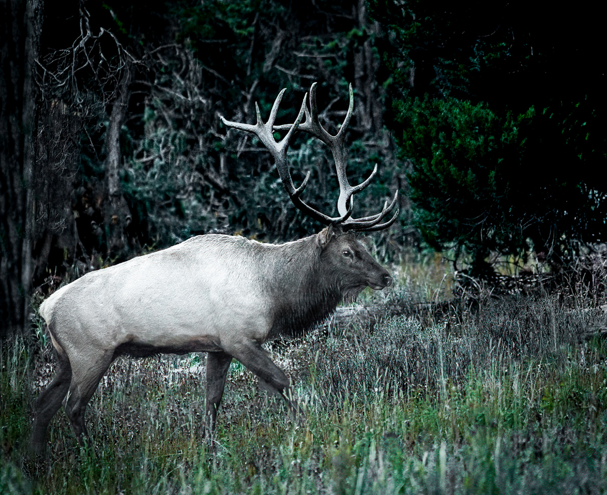 Wonderful capture. That must have been a fantastic trip. I agree that the background is a distracting and the twigs interfere with the beautiful antlers. I worked on it very quickly (needs more attention to detail), but tried removing some of the distractions and lessened the blue tint. I also flipped it since I am always getting criticism to have photos go from left to right so thought I would give it a try here. Can't wait to see more from your trip! |