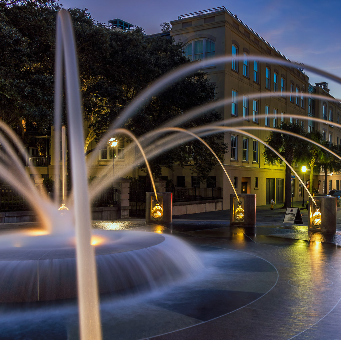 I find the image confusing, though: am I viewing the fountain, with the receding street that happens to be in the background? Or looking down a city street in the evening, towards a nice sunset, and an interesting fountain that happens to be in front? The receding perspective and headlight/taillight trails suggests the former. The brightly lit fountain, with the lines the lead to the heart of it, would suggest the latter. To me, this creates a tension that is inconsistent with what otherwise seems to be a serene image. Jerry's crop reconciles this in favor of the receding streetway. I tried cropping to favor the waterfall, but I don't think the result was particularly successful. |