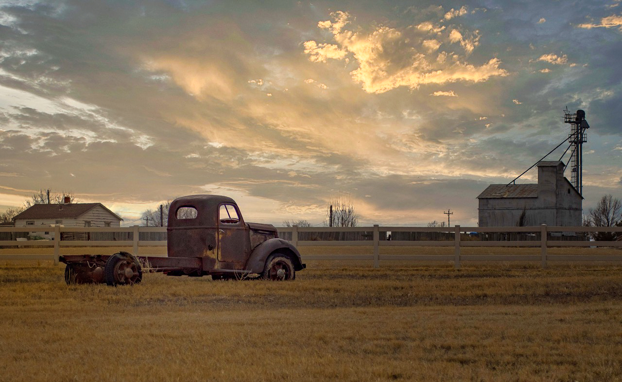 I think you could get away with upping the drama in the sky a bit. I took the liberty of tinkering with the image, and adding a bit of light bleed in from the left, cooling the right side a bit, grading in a bit of texture to bring the foreground forward a bit, adding shadow this side of the truck, and finally pushing up both texture and clarity on the truck. It *is* the subject, I assume? I hope I kept it subtle enough that one would know unless it were pointed out.