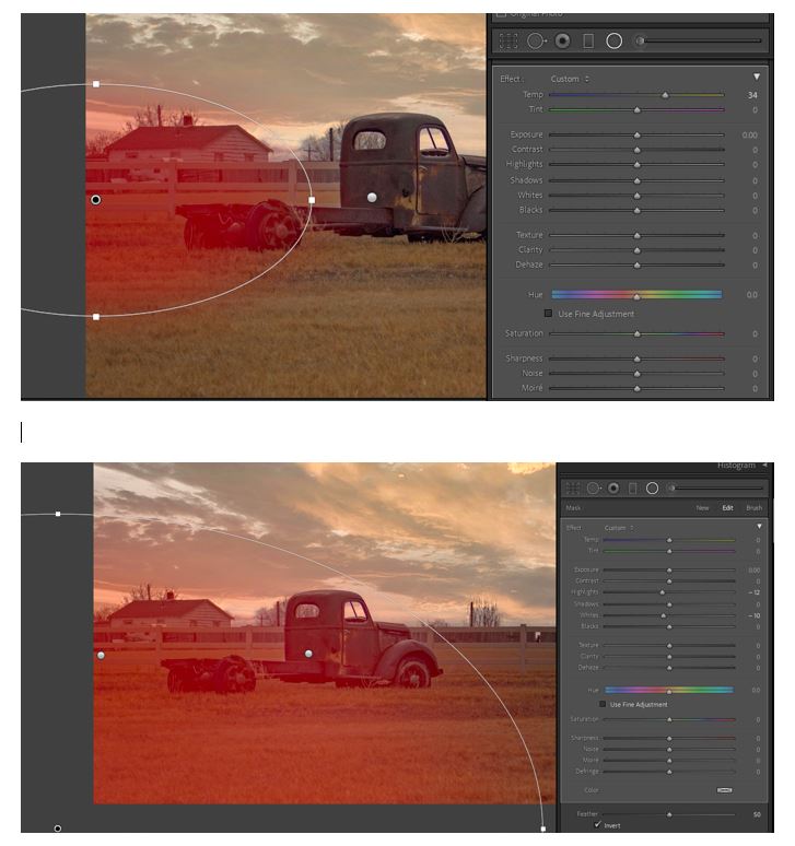 For the light bleed, I first added a radial filter centered on the left edge near the fence and extending far enough to compass the farmhouse and the field in front; for this filter I just add (quite a bit of) warmth.