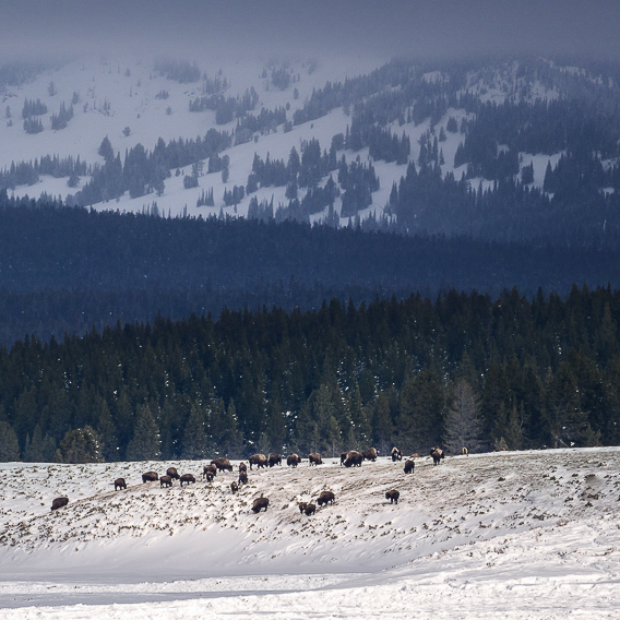 The letter-box format accentuates the vastness of the scene. I find myself wishing, however, for greater prominence given to the herd of bison, so I experimented with a square crop. I chose to eliminate some foreground, some sky, and the whole area to the left of the herd. This tells a different story, and it might not be at all what you had in mind. (I did also remove the loner off to the right of the herd.)