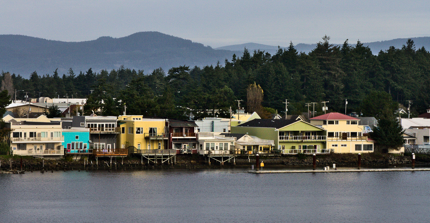 It seems from your narrative that the colorful buildings are an important part of the story. I think you can do a bit in post to emphasize that. As always, I fiddled with it in LrC. I pulled in both the black and white points. I find the easiest way in LrC to mask an adjustment to a horizontal band is to view it in reduced size, and then add a radial gradient that's very elongated, so that it forms a band where I want it. This I did to mask in adjustments to the buildings: increased contrast, dropped the highlights a bit, and bumped the saturation aggressively. I also used a brush mask with reduce exposure, contrast and highlights to tone down the odd looking (to me) tree (?) that was catching the light and kept tugging at my eye. |