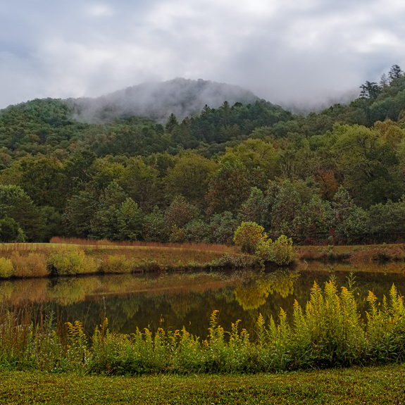 Regarding not getting the whole pond: in such situations, I usually choose to crop in far enough to reduce the sense of "almost but not quite all". There are several options, but I found I liked a square crop. I including the following considerations in choosing the placement: by removing much of the right hand side, I got a bit of mimicry between the hilltops and the tops of the goldenrods; I wanted to place the larger shrubbery far side of the lake on a golden-ratio intersection; I felt that the interest factor with the clouds coming over the hills was enhanced by removing some of the sky that competed for attention; after making those changes I felt I needed a little less grassy foreground.