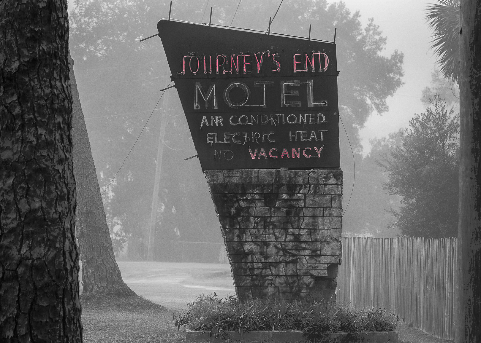 I like the B&W version, and I suspect this couldn't be made to work in color. I think the image benefits from heightening the separation of the sign from the background, darkening it, and applying some clarity to the lettering. Now you may feel that I lost something in berightening up the back as much as I did; in my defense, I keep saying "walk towards the light ..." (aLL edits in LrC).