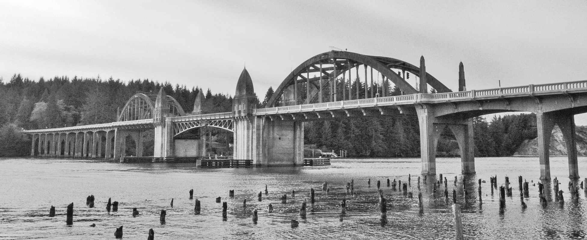 An interesting juxtapositioning of subjects: the bridge, which I'm guessing to be of WPA vintage, and the pilings that are the only remains from something (piers, maybe?) now long gone.