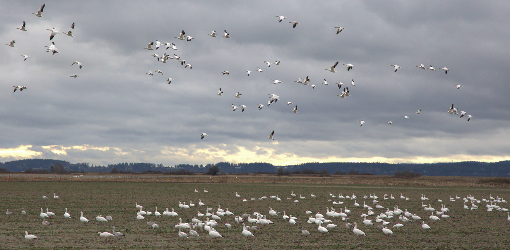 I think your panorama-ish format helps to accentuate the horizontal aspect, which in turn contributes to the sense of motion. In fact, I think it would not hurt to get a wee bit more extreme by trimming up from the bottom up to near the edge of the standing birds, and down from the top in a similar fashion. I find the "clump" of birds in flight at the left edge distracting, so I cropped in to make 'em go away. |