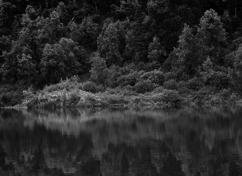 You've succeeded in the B&W conversion in crerating a lot of visual interest around the shoreline and the edges of the trees. The mood is peaceful, and perhaps a bit somber. (The bright rock/log/structure shoreline right is very distracting and I'd recommend making it go away.)