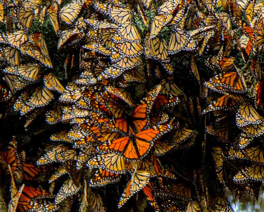 Composition-wise, one hears all the time advice to trim away everything that doesn't strongly support the subject or story. I wonder if in this case you wouldn't have been better served by a tighter crop? One that dispenses with the comparatively featureless and (appropriately) soft gray-greens? This would also help to odispose of the brighter sky patches. I think, too, that this could be done without diminishing the marvel of the masses of butterflies, even if the image no longer showed as large a massing. In fact, by cropping in so tight that there is no discernable limit or edge to the mass, the viwer is left to imagine that the mass extends indefinitely in all directions.
