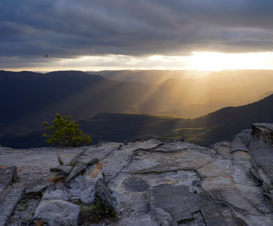 All in all, it feels to me like a very promising capture. I'm perplexed by your cropping decision. To me, although it does somewhat concentrate the attention on the warmth of the sunrays, I find it now feels cramped. Personally, I alsao feel the loss of some interesting foreground subject, but I have to remember that I take a particular personal interest in stone. The rioght hand side of the frame is heavily weighted by the extended band of brightness; this band converges with the dark ridge in a sharp point very near the edge of the frame and this serves to direct my eye out of the frame. I returned to your original min order to be able to restore the top and bottom of the image, and then cropped in from the right to the point where the upper half of the right edge is now organized into seveal bands of more or less equal width. This regularity/uniformity tends to act as a barrier as the eye sweeps to the right. A benefit of this crop turned out to be an alignment of the leading lines (now restored) in the stone lower left with the sun rays sweeping down from the top. To me, this alignment functions as a unifying force pulling together the bright upper right with the darker lower left.