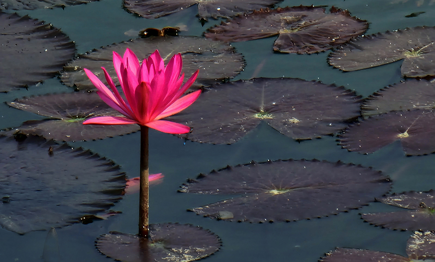 Kamal, what a beautiful lotus. The colors are amazing. The pink against the muted pads is wonderful. My only suggestion, like most everyone else, is it could be more striking with some cropping. I gave it a go with another approach. Nice job. |