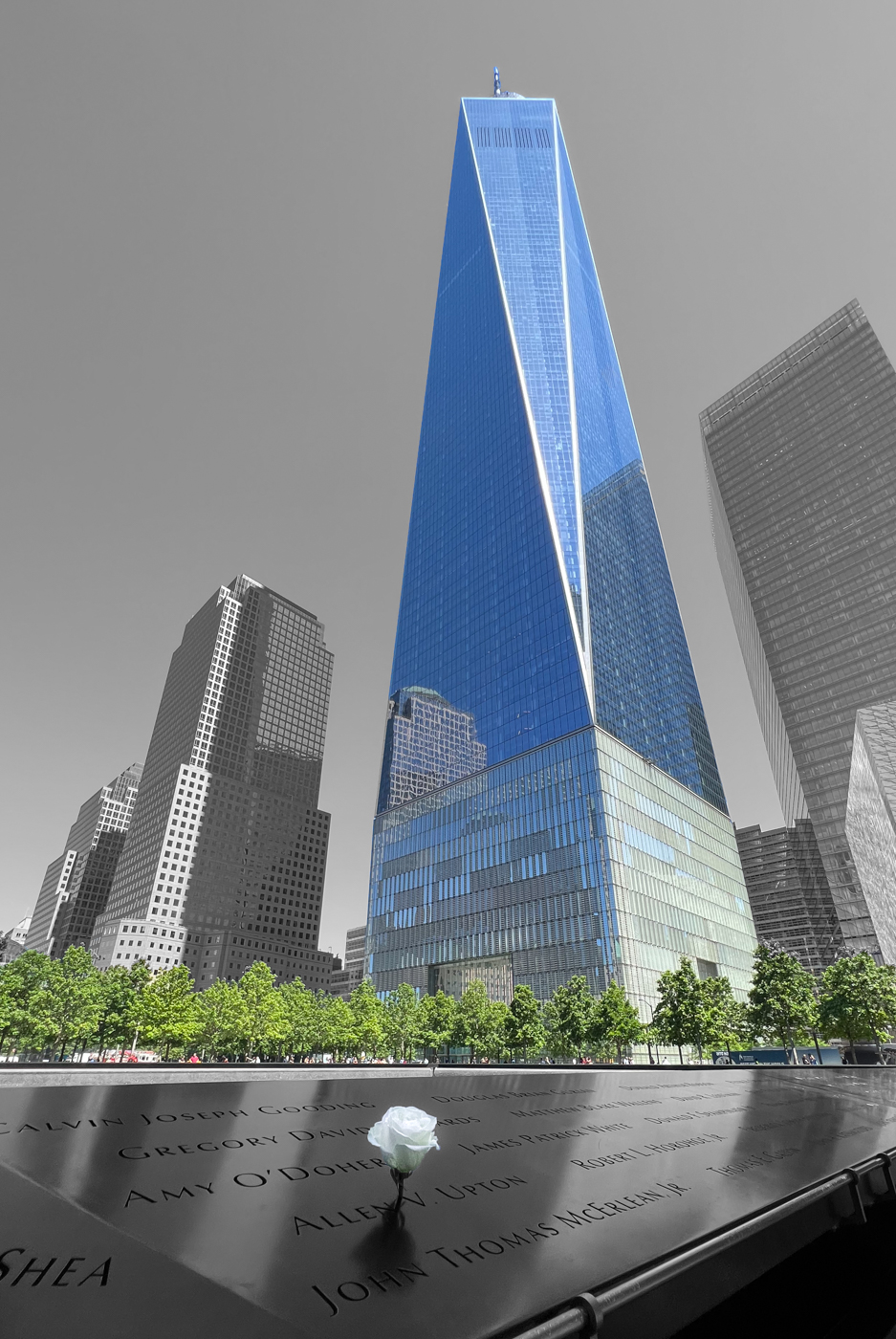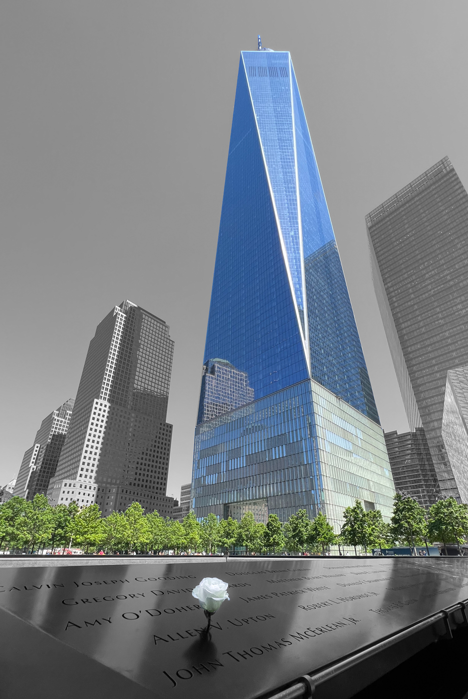 Thanks all - appreciate the feedback and different perspectives. I had chosen to go with the mono (for the sky non-WTC buildings) specifically to contrast the rebirth at that location (using color in the trees, people and new building). Terry, I am impressed by your selective re-straightening of the other building, but (as I stare at both of them!) I do think the tilt conveys a feeling of impending collapse, uniquely appropriate to this image. For any other skyline, would agree with your treatment! Had missed the hue in the flower, agree it's a distraction. Reprocessed to go for a clean white... |