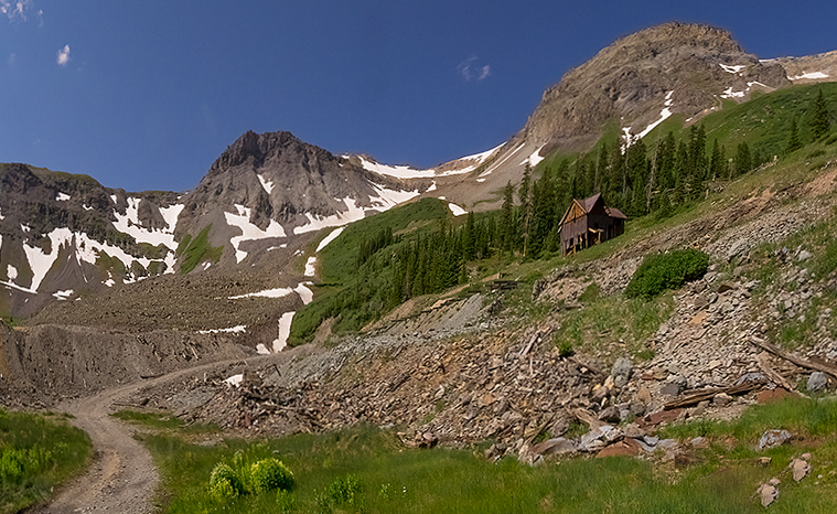 Hi Jim, great scene - challenging as you've pointed out due to the lens distortion. The focus for me is as Terry pointed out the road leading into the mountains. Looks like there is a parking area in the lower left that distracts a little from the start of the leading line. Iried cropping a little more off bottom. I really like the cabin as it gives perspective on the scene. The barrel (in its current form) is not doing as much for me, and I might consider removing it. Agree with Terry - would put back some color adjusted clouds... Beautiful location, will admit I had to look up where Ouray is. Adding it to my list! |