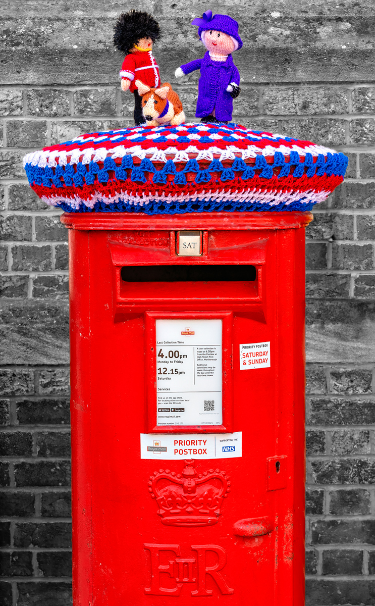 This is wonderful! I really love that you found this. Only though is that the background color seems to detract from the focus of the knitting and the postbox. Perhaps desaturating the background? quick trial making the back B&W, might too much, but could maybe something in between is better... Great image. |