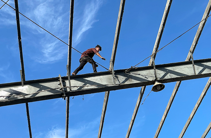 I like the cleaner look without the heavy cross beam at the bottom in the original image. Which got me to thinking, what if you rotated it just a bit? I turned it so that the guide wire comes in from the corner to lead your eye to the young man. Assuming this is not PJ, I lightened the shadow on his face a bit, too. Just a couple of ideas to consider.