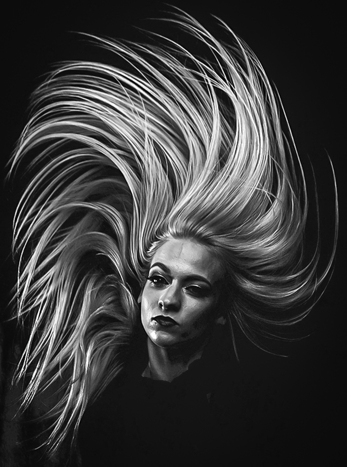You might consider cloning out the emblems on her sleeves. They seem to be a bit distracting. Come to think of it, so are her hands. Have you tried cloning those out, also to really bring the focus on all that wonderful hair? Just a thought...