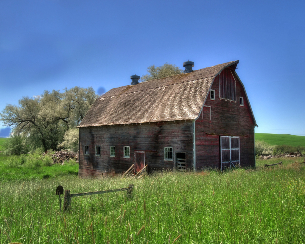 I like barns and I like the palouse. To me this image is more about barns and I am not enthralled with what Photomatix has done to your barn. To me there is not a large problem with dynamic range in the original. For my version I took your image and simply applied the shadow/highlight tool to the image and have what is to me a much more pleasing depiction of the barn. |