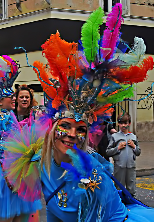 Beautiful image. The image is colorful and the expression of the woman is interesting too.There are some distractions in the image. The letters on the black border of the building, a man on the right side and a small board on the top. These can be cloned out. I tried a quick work on those. The resulting image is given. |
