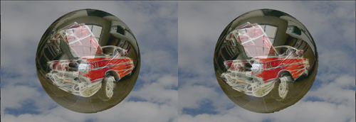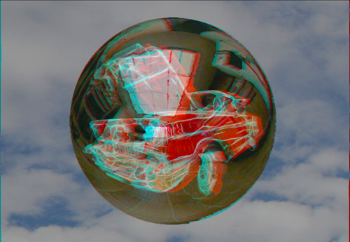 Interesting composite. The bubble is coming out of the window. I could not see any 3D effect on the car or bubble. The only depth I see is between the bubble and sky. No idea how to work on it. |
