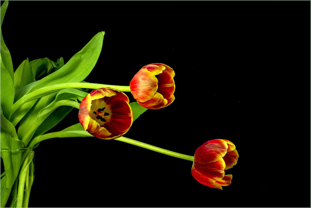 Beautiful image. The image is sharp with good lighting. The cropping is good. I liked the composition suggested by Joan, but without shortening stem. In your post processing the leaves became pale. A little adjustment of green color in highlights will look better (a quick adjustment given) |