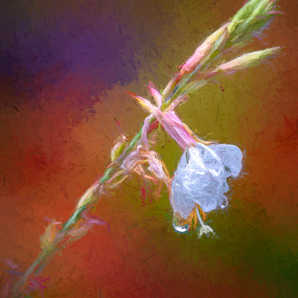 Nice image. I liked both original and edited one. In the artistic image, the water drops get merged with the petals. I think, a horizontal flip of the image will look better. |