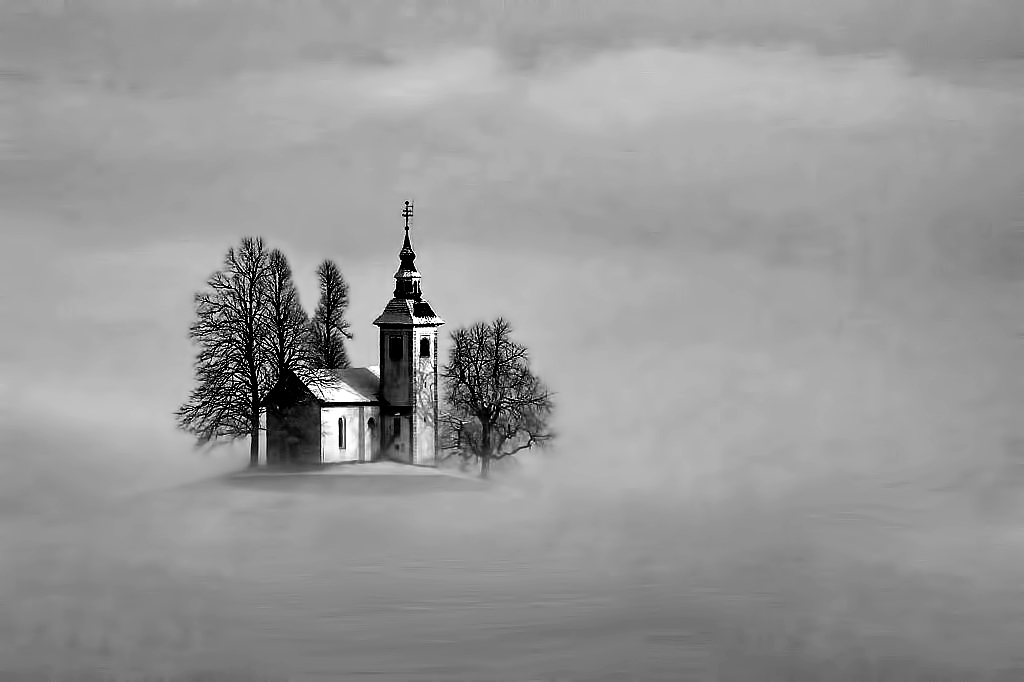 Beautiful image. I liked the 'Fairy' look of the church. The mist and lighting look very nice. I think a little 'L' shaped trimming may look better. To me this image will be a good one for B/W. Just tried a quick one. |