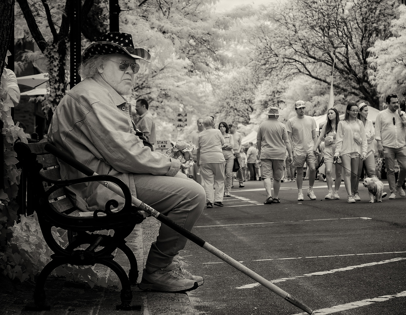 Excellent street picture that is interesting and engaging. I also take street pictures with the IR camera. While it doesn't have much of the common white foliage, the IR picks up shadow details that standard b&w may not show.
