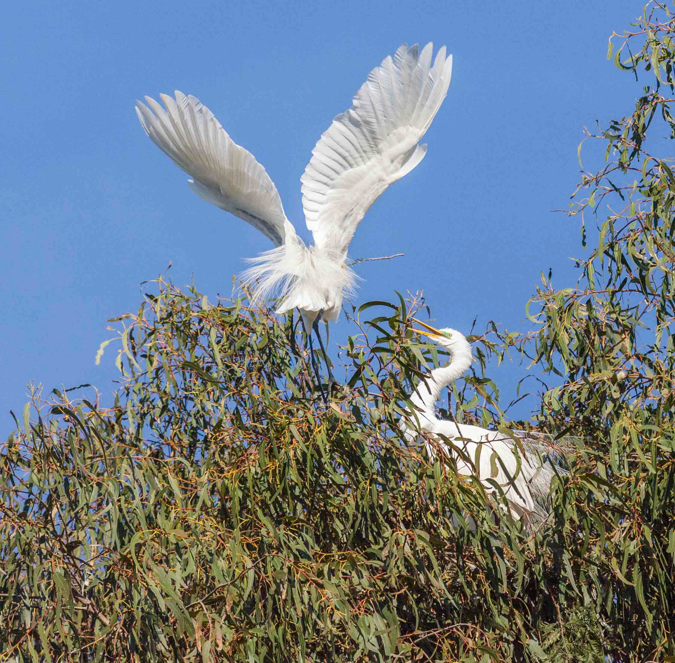 After visiting this site 2-3 times a week for a few months, I began to notice different patterns emerging during the breeding season. I have many pictures of the egrets flying, though after awhile, I begin to see a pattern in myself taking different types of images that told a story. Egrets picking up branches for nesting material, egrets flying with sticks, courtship, "stick handoff to mate" to build a nest and many more images that together gave the viewer a better idea of the Great White Egret's breeding season.. Thank you for your nice comments, Ian. |
