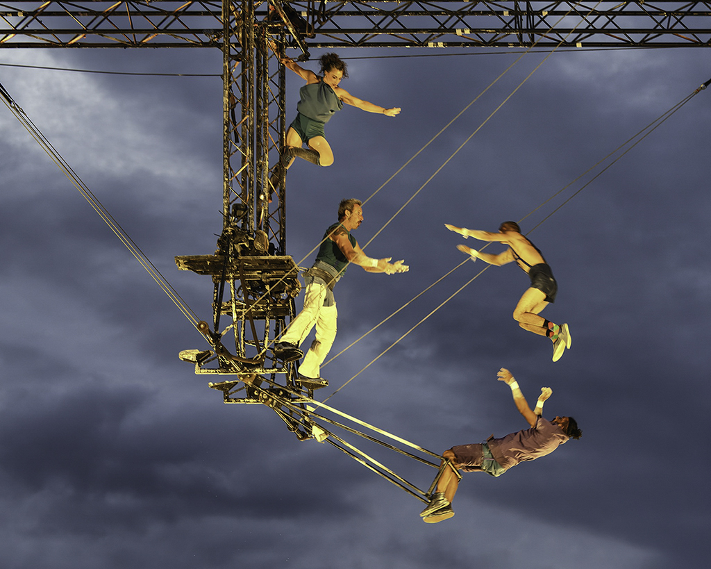 The use of lines, especially triangles, is very strong in this image. I can see triangles with the three artists on bottom and then another triangle with the three artist on top using the person on the top and bottom as the pivotal points thus creating two triangles. Also the use of the wires on the right and left connect to form triangles. As Sanford mentioned, the performers are in the right spot. The only suggestions I might make and they are minor would be to straighten out the horizontal rigging at the top and remove the trees at the bottom of the image. I don't know what your ISO was but you might want, with people moving (at nighttime) in an image, to have a higher ISO to capture movement but this might impinge on the quality of your image. Sophie, I feel that you are really talented at capturing the "right moment" in your images and this image is no exception. Great image Sophie. |
