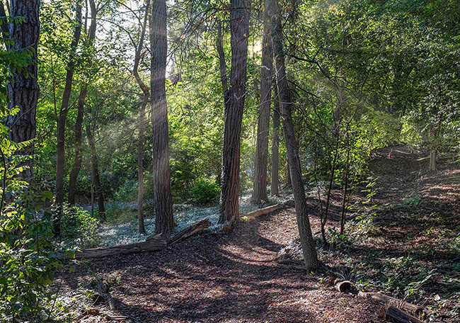 I agree somewhat with Albert. Either clone or crop the tree leaning out of the frame on the right, and crop some on the left. (I think the tree is a natural blocker/framer, but the bright small tree refocuses the attention. Leaving a small amount fixes that, I believe.) This is a nice scene, and for fun sometime, Belinda's suggestion of something on the path could work well. When I saw this the first time, it begged to me to have sun rays. So I cheated, and used the Sun Ray filter in Luminar. |