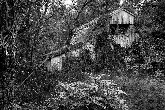 A great find. Looks like this would be spectacular with fall colors to give contrast to the grey barn. There is a lot of great detail here. I wonder though if darkening the left edge and other areas might help focus more on the barn. I tried burning in the foreground around the bush and tree, especially to give more dimension to the foreground. |