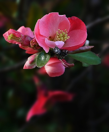 This makes a mysterious dramatic night style image. I think that possibly you could crop the final version to a horizontal image, as so little is left in the background. This then eliminates the slight distraction at the bottom. In looking at this some more, I prefer the color/contrast for the original main flower, as the post processing took some of that out. Perhaps you can paint some of the original flower attributes back in? (Cannot recall if that is a feature in Snapseed.) I tried selecting the main parts of the flower in Photoshop, and then darkening and blurring slightly the other part (background), and then used a tighter crop. I went ahead and added the extra blur to the already out of focus bloom at the bottom. My selection is a little rough, as I did not spend the time to refine it. One could argue that maybe my version would be better as a horizontal. |