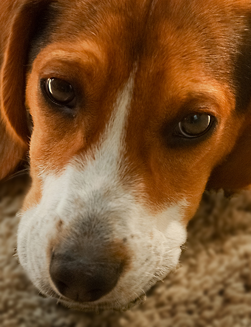 Such sad eyes. Good exposure, color. I like the placement for this portrait. Possibly selecting the carpet, as the sharpness and texture may be in slight competition, then putting the selection on its own layer to blur and darken slightly may help to keep the focus on the puppy. I would consider this as only a minor change. See what you think. |