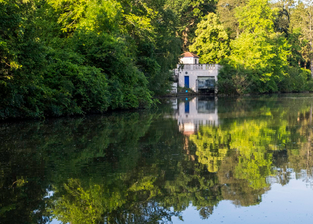 Another choice would be to make a selection of the sky. (I used a luminosity mask to get it.) Then you could use curves to darken and add more blue, and possibly add a tad more blue saturation. It would not be a huge difference, but would definitely help. Of course you could then paste in a very light sky with clouds in it, but that means adding the corresponding inverted portion into the water reflection, and that could be a large task. Because the reflection of that portion of the sky is light already, you might be able to get away with not doing that with the right type of light sky. That is what I did here; it still needed some finessing, but could work. I also thought that there might be too much water, and cropped so that the building is in the rule of thirds more. The branch in the lower right seemed out of place, and I removed it, while also using the spot remover to take out some of the dark stuff in the water. |